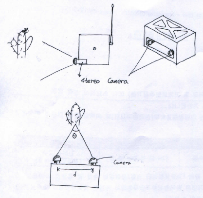 Our satellite, similarly, has two cameras called stereo camera. So, a main computer of it takes two pictures per one shot. As these two cameras are separated each other, there is difference of x-position on the pictures. As we can measure this difference of angle (theta) and distance between cameras, it is possible to calculate how far some points on object are. After combining this points, we can get 3D image of the surface of it.