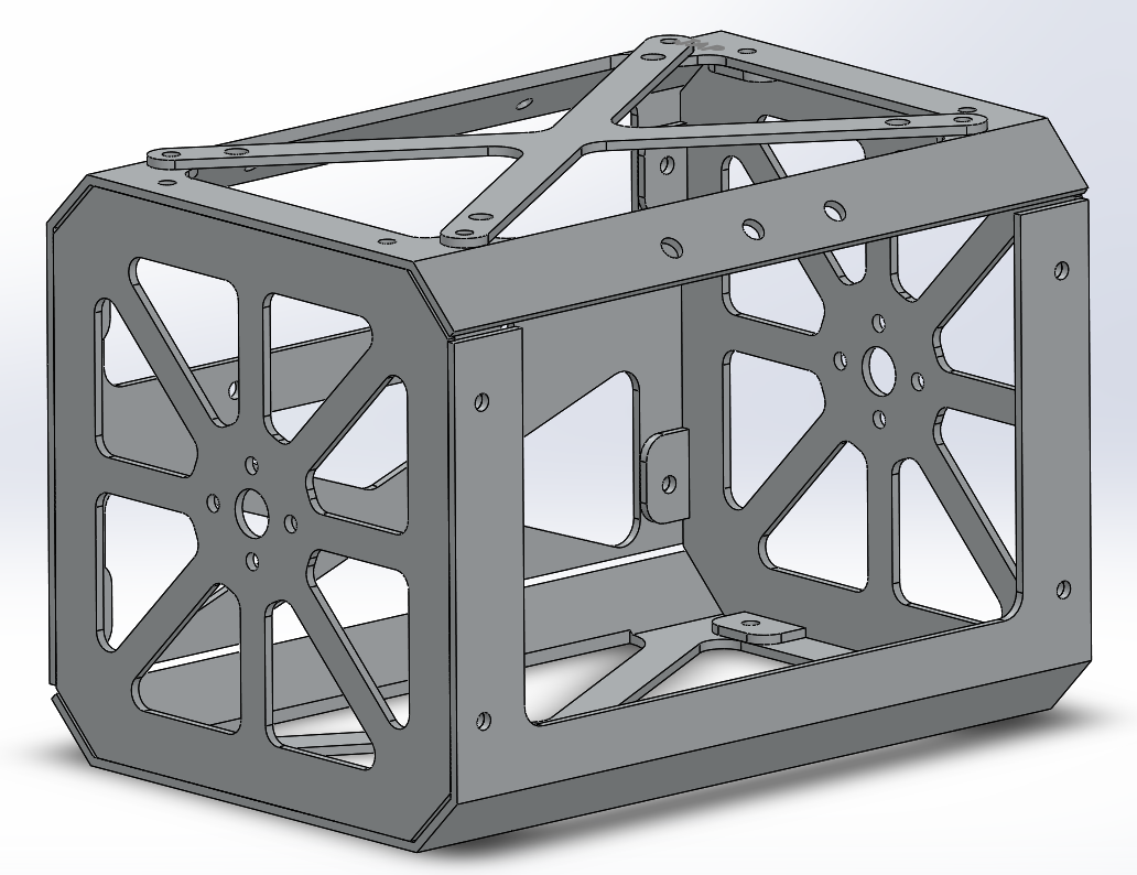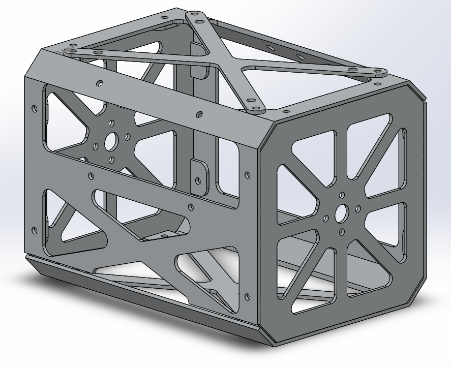 The ARLISS Cansat regulation asks the size of the satellite to be smaller than Φ146*240mm cylinder. We have designed the body structure as a square pillar shape at first. However, for the maximum space efficiency, we invented an octagular body frame cutting off four edge of the square. This design increased internal space of the satellite without an increase in total diameter.
