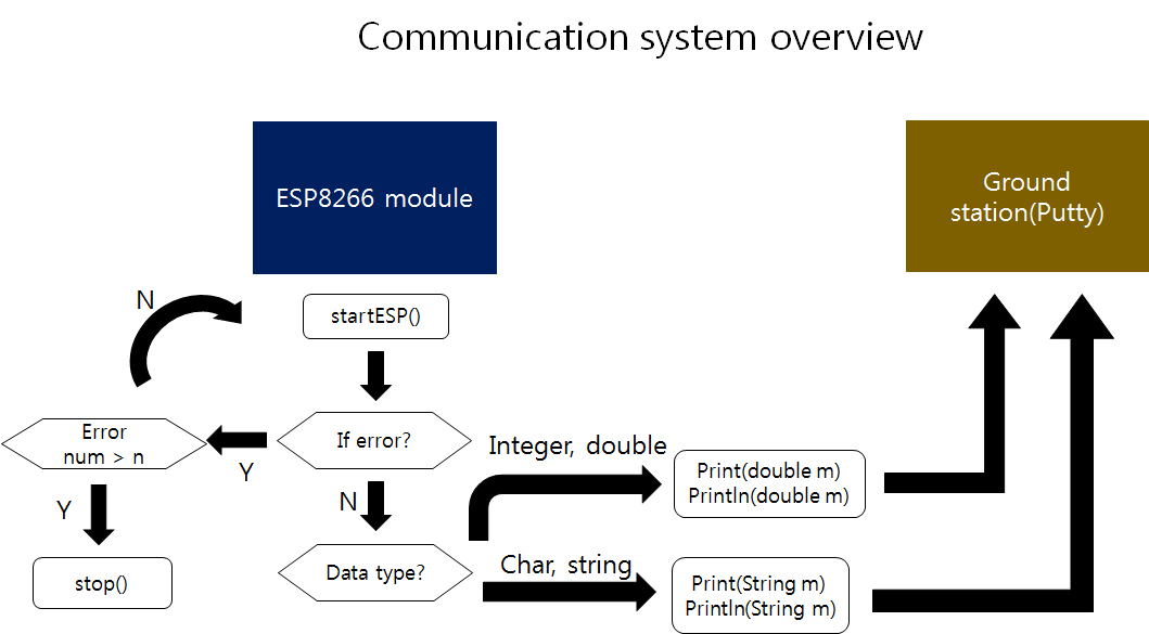 - ‘startESP()’ resets wifi module by sending start signal to module. Also it checks if there is wrong operation. When it finds some errors module reset itself. If not, it gets IP address(‘getReadyIP()’) and starts sending message(‘Print()’). And it also counts the number of error(‘geterrornum1()’, ‘geterrornum2()’). So if the module still has some errors after many resets, it stops its operation(‘stop()’).