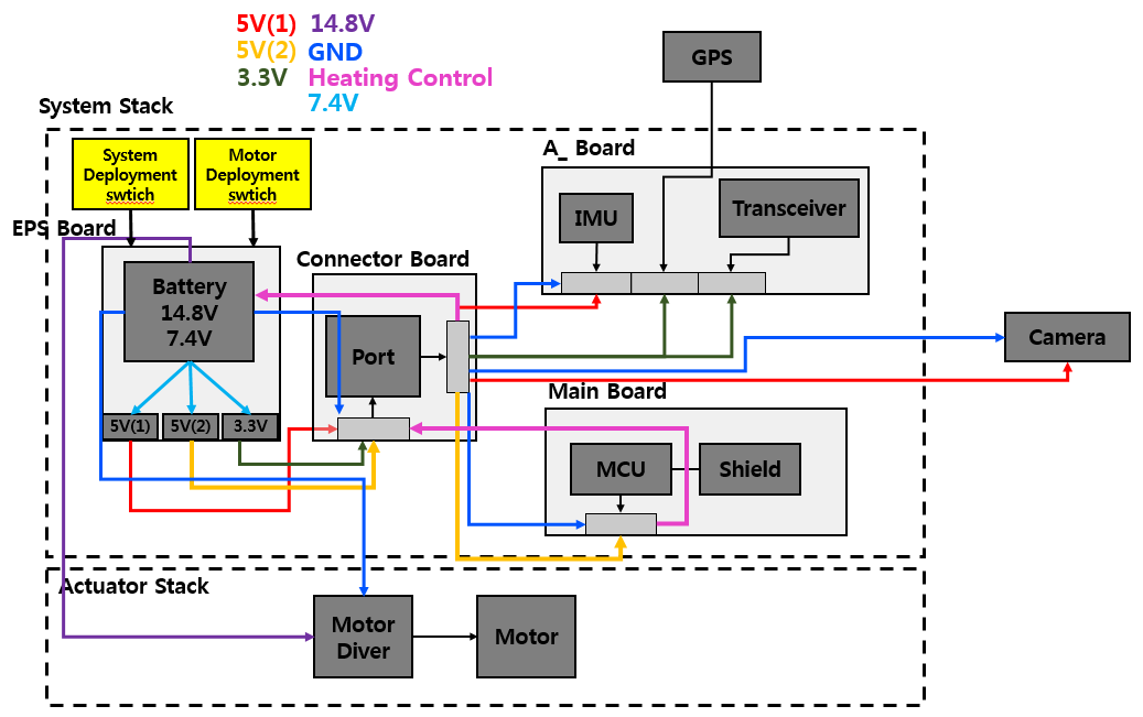 The above diagram is v.3.0 schematic for all system. The concept cannot be understandable without other systems because EPS should consider all the details specs of parts. Only the small EPS Board diagram is for EPS system. The overall systems can be divided to 2 Stacks, System Stack and Actuator Stack.