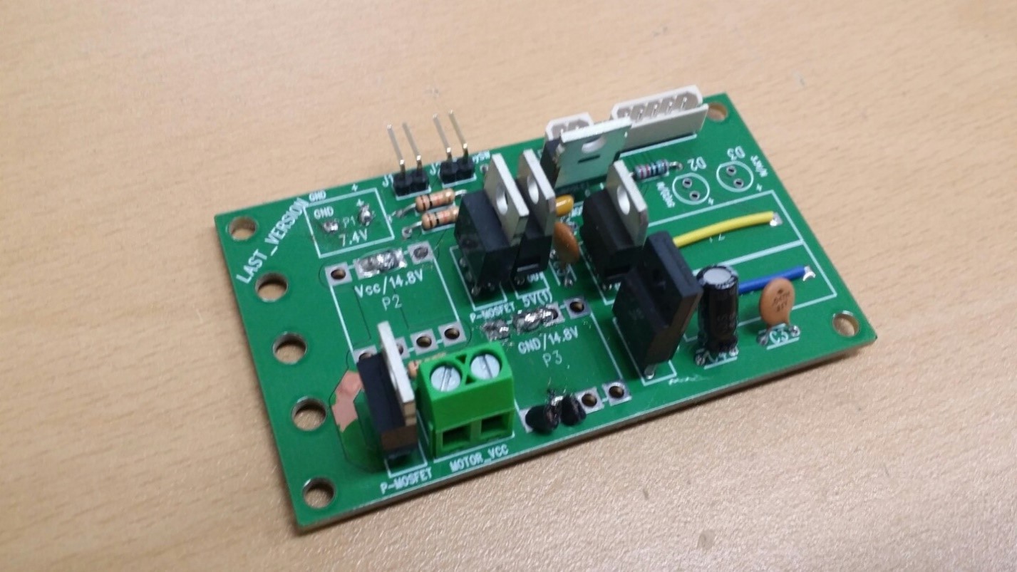 The battery’s voltage should not be smaller than any of the max voltage of parts. In this part the content should be focused on is the availability. At first time we use 11.1V(3S) for overall system but the problems for driving we changed it to 14.8V(4S). The shut-down problem for MCU rises, nevertheless. So we add 7.4V(2S) for overall systems except Motor. Finally we picked 14.8V for Motor Power because of the torque. And 7.4V was for other systems because they use 5V or 3.3V for Vcc.