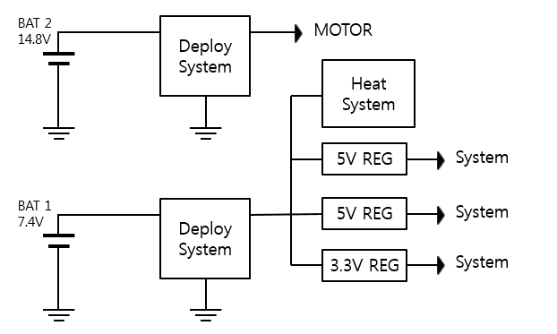 In Electrical System battery seems like a pump in canal system. As the pump in canal makes the force that water can flow, battery also makes the current. So the battery let all the circuits worked. However the problem is if there are many loads in circuit system, the pump should be overloaded. So we should select proper batteries for system. There are 4 points that we consider for selecting batteries. Voltage, Max Current, Discharge Rate, Capacity. The reason we considered these is so many parts and the torque of motor. In our satellite we selected 14.8V for motors and 7.4V for other systems. This step is proceeded with checking parts of other system due to the analysis of specification. The focalizing of specification is needed because the parts influence the process most.
