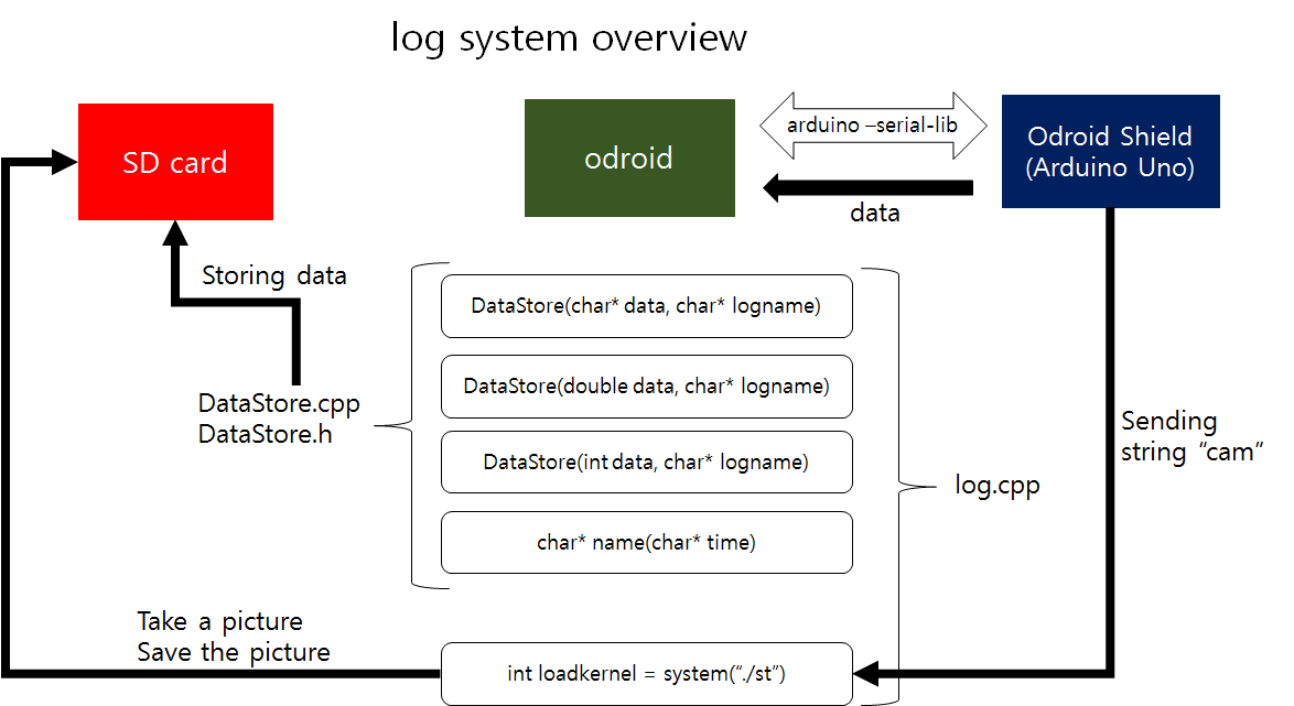 - It can also save picture data. When the odroid shield sends the string “cam” to odroid, log.cpp takes a picture and save it.