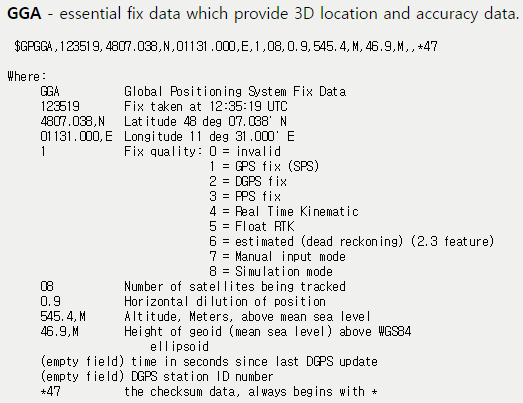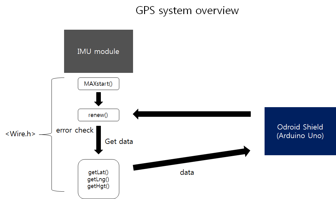 - After read register, the data presents as NMEA(The National Marine Electronics Association). ‘renew()’ gets GPS data from NMEA. Many functions are in ‘renew()’. The NMEA data has latitude, longitude, and height data sequentially. So ‘getPhrase()’ separates each data. And ‘spellCheck ()’ checks the form of data. If the form is wrong, MCU regards it as error and operates ‘renew()’ function again. ‘Stof()’ change string type data to double. And ‘getLat()’, ‘getLng()’, and ‘getHgt()’ functions represent latitude, longitude, and height in double type.